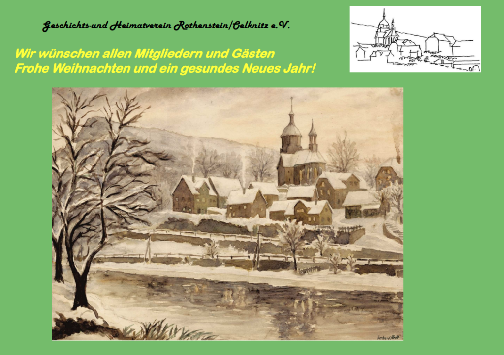 Der Heimat- und Geschichtsverein Rothenstein/Oelknitz e. V. wünscht allen Unterstützern, Mitgliedern und Gästen ein frohes Weihnachtsfest sowie ein gesundes und glückliches neues Jahr.