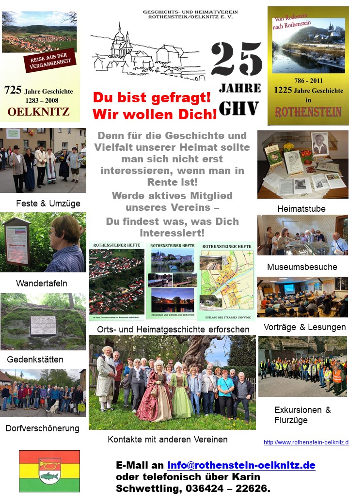 Am 15. Juni 2024 ist es soweit: Der Heimat und Geschichtsverein Rothenstein/Oelknitz wird mit einem Stand auf dem Sportfest des SV08 Rothenstein vertreten sein. Hier bietet sich die perfekte Gelegenheit, unseren Verein kennenzulernen und mehr über die spannende Geschichte unseres Dorfes zu erfahren.
