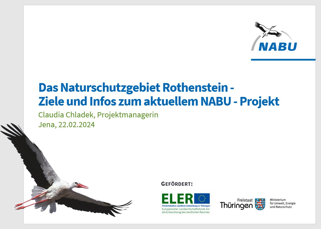 Auf Einladung des Geschichts-und Heimatvereins e.V. sprach Frau Claudia Chladek am Donnerstag im gut besuchten Sängerheim über ihre Arbeit im Naturschutzgebiet, das laufende Projekt und die Geschichte des Gebiets. Frau Chladek vom NABU Thüringen e.V. ist Projektmanagerin für den „Schießplatz Rothenstein“ im Naturschutzgebiet „Spitzenberg – Schießplatz Rothenstein – Borntal“. Sie berichtete über den Stand des ENL (Entwicklung von Natur und Landschaft)-Projektes, die Erfassung des Gebietes insbesondere schützenswerter Tiere und Pflanzen sowie die Pläne zur weiteren Gestaltung des Naturschutzgebietes. Fast 50 Besucher aus unserer Gemeinde aber auch aus der Umgebung waren gekommen, um ihre sehr interessanten Ausführungen zu hören.