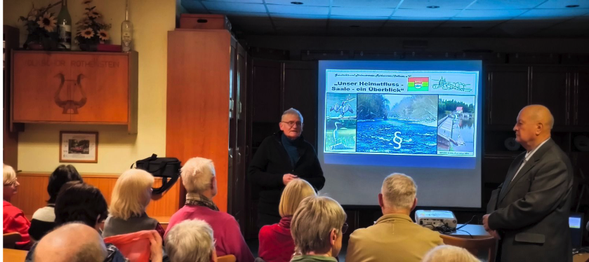 Der Geschichts- und Heimatverein Rothenstein / Oelknitz e.V. hatte am 22. Januar zu einem Vortrag mit dem Titel „Unser Heimatfluss – Saale – ein Überblick“ eingeladen. Vortragender war Gerhard Kemmler, langjähriger Vorsitzender des Anglervereins Rothenstein, der seit Jahren als Gutachter in Fragen Gewässer- und Hochwasserschutz um die Erreichung eines guten ökologischen Zustandes unserer Gewässer kämpft.