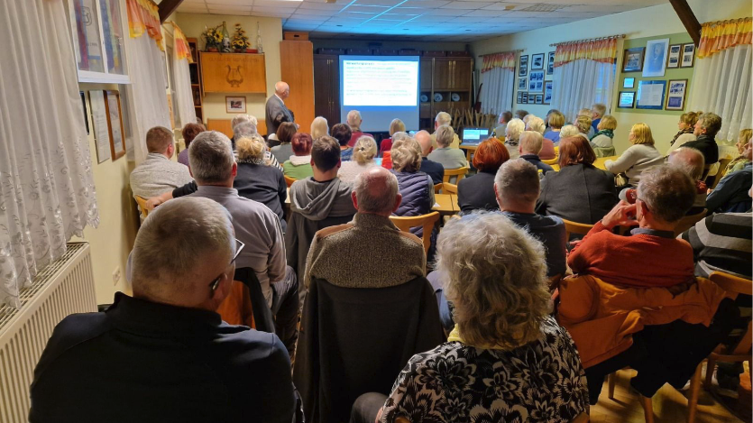 Über 50 Gäste hatten sich eingefunden und hörten mit wachsendem Interesse, wie es um unsere Gewässer, insbesondere die Saale, steht und wie EU-Richtlinien seit Jahren nicht umgesetzt werden. Dabei spielen Kleinwasserkraftanlagen, von denen es in Thüringen über 200 gibt, eine große Rolle, denn mehr als 22 % der Fische werden dort getötet. Am Beispiel der Anlage in Jägersdorf/Schöps wurde gezeigt, dass trotz schlecht platzierter Fischtreppe für ca. 70 % der Fische die Aufwärtswanderung in der Sackgasse der Lache am Kraftwerk Jägersdorf endet. Die durch derartige Anlagen erzeugte Energie steht in keinem Verhältnis zur Schädigung unserer Umwelt! Leider sind auch die Kormorane eine Ursache für die dramatisch sinkenden Fischbestände, da sie EU-weit jährlich 350.000 Tonnen Fisch fressen. Hier fehlt ein gezieltes Kormoran-Management! Zusätzliche Probleme mit Schadstoffeinleitungen von Landwirtschaft, Kläranlagen und Reifenabrieb, durch die Talsperren verursachte Absenkungen der Wassertemperatur, nicht laichender Fischbesatz durch die Angelvereine und andere Faktoren verschlimmern die Situation weiter. Statt der geforderten 1000 kg/ha als guter ökologischer Zustand beträgt die Fischbiomasse in der Saale in Thüringen meist unter 20 kg/ha; vor 40 Jahren lag der Wert noch bei etwa 500 kg/ha.