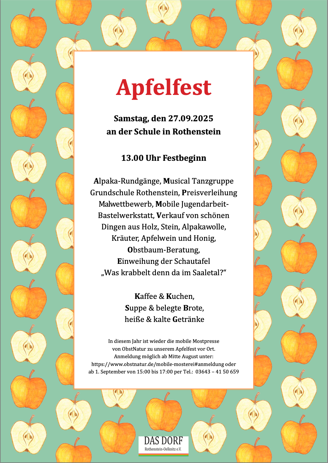 Am Samstag 27.09.2025 ist es wieder so weit, das mittlerweile vierte Rothensteiner Apfelfest kann beginnen. Wir hoffen auf gutes Wetter und viele interessierte und gut gelaunte Gäste. Wie schon in den Vorjahren erwartet Sie ein reichhaltiges Kuchenbuffet, leckere Suppe, belegte Brote und vieles mehr für das leibliche Wohl. Oder schauen Sie doch mal zu den regionalen Produkten, die am Landmarkt zum Verkauf stehen, z.B. aus der Kreativmanufaktur oder schöne Dinge aus Holz, Alpakawollprodukte, Honig, ein reiches Sortiment von Apfelweinen und vieles mehr.