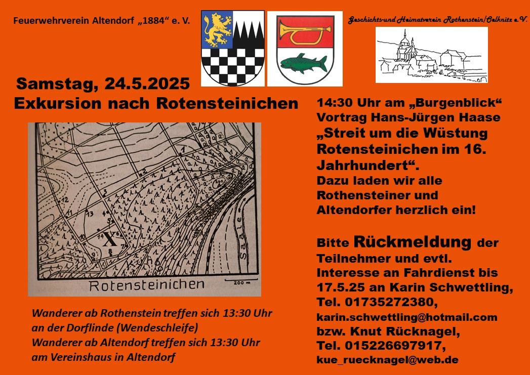 Der Feuerwehrverein Altendorf „1884“ e. V. und der Geschichts- und Heimatverein Rothenstein/Ölknitz e. V. laden herzlich ein zur gemeinsamen Wanderung und einem spannenden Vortrag von Hans-Jürgen Haase zum Thema: