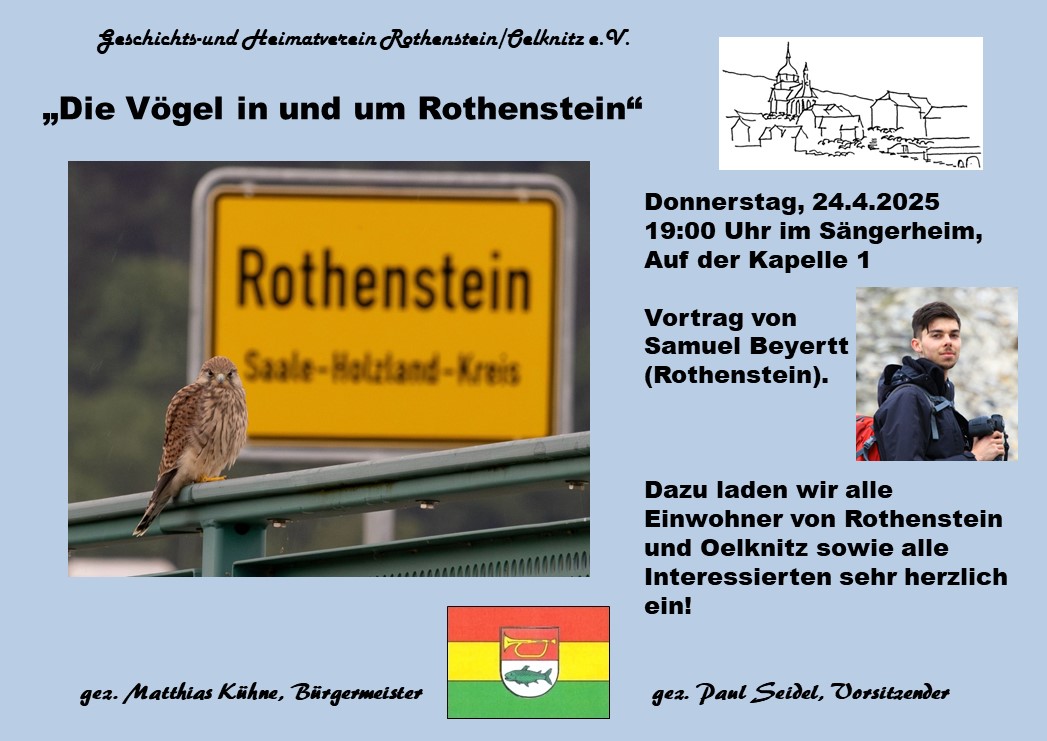 Der Geschichts- und Heimatverein Rothenstein/Oelknitz e.V. lädt herzlich ein zum Vortrag über die Vögel in und um Rothenstein. Am 24. April um 19 Uhr im Sängerheim.